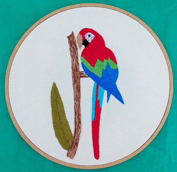 Bordado a mão estilo livre, retratando a arara-vermelha. Tecido em algodão cru, linhas 100% algodão, bastidor de madeira.