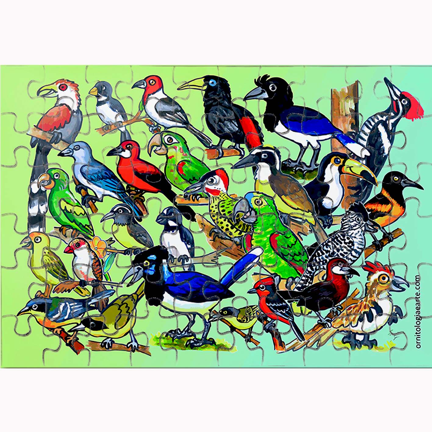 Quebra-cabeça com ilustração passarinhos, impressão em papel cartão 60 peças de ilustração original de Fernando Igor.