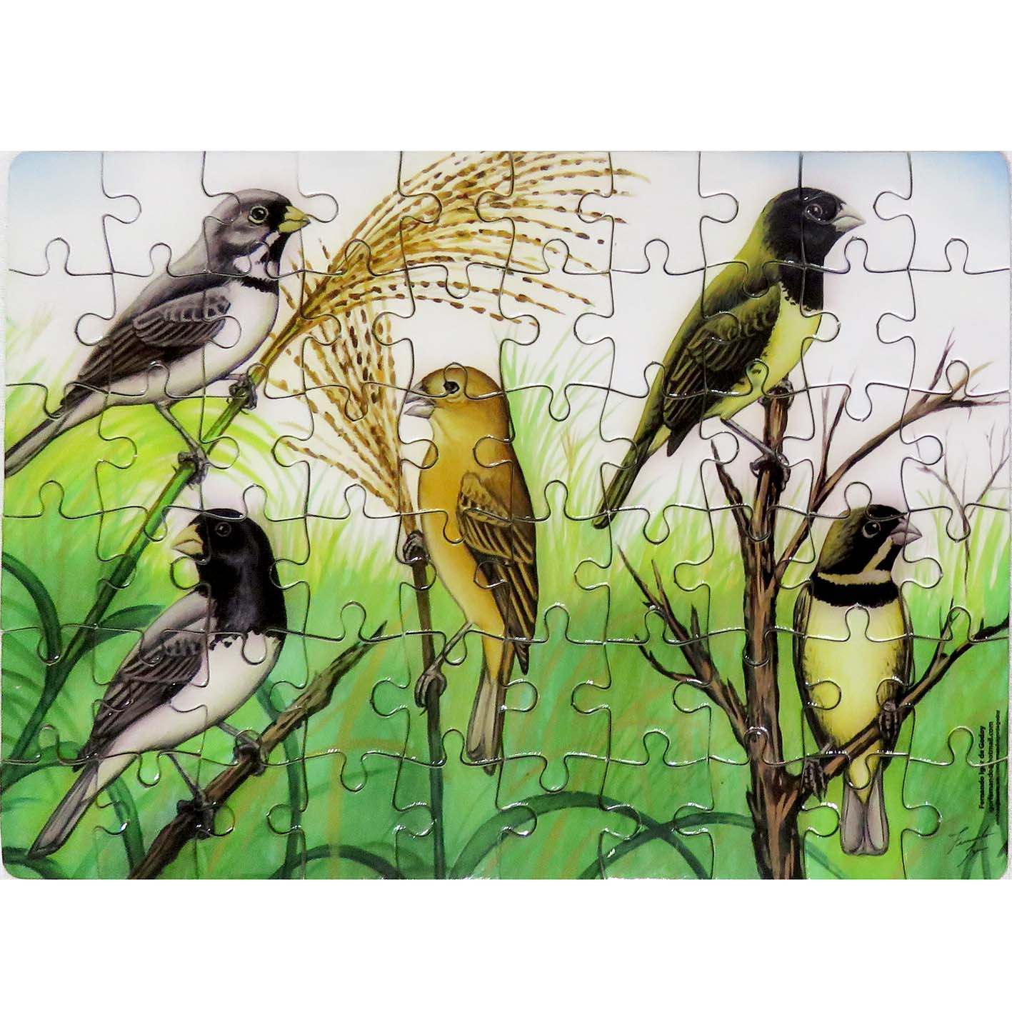 Quebra-cabeça com ilustração coleirinhos, impressão em papel cartão 60 peças de ilustração original de Fernando Igor.