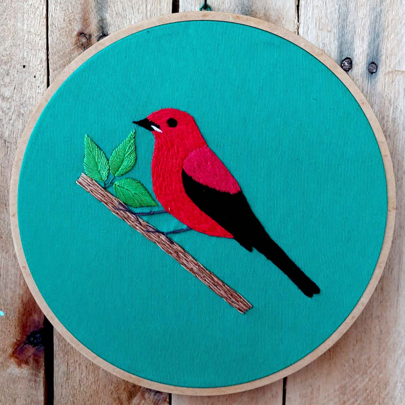 Bordado a mão estilo livre, retratando o tiê-sangue. Tecido em algodão cru, linhas 100% algodão, bastidor de madeira.